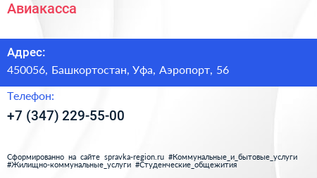 Авиакасса по адресу 450056, Башкортостан, Уфа, Аэропорт, 56 в дальнейшем Организация, размещена в следующих категориях: