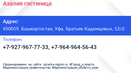 Азалия, гостиница по адресу 450059, Башкортостан, Уфа, Братьев Кадомцевых, 12/2 в дальнейшем Организация, размещена в следующих категориях: