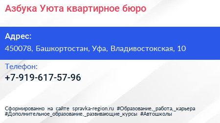 Азбука Уюта, квартирное бюро по адресу 450078, Башкортостан, Уфа, Владивостокская, 10 в дальнейшем Организация, размещена в следующих категориях: