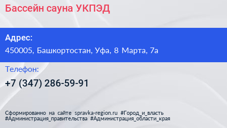 Бассейн-сауна, УКПЭД по адресу 450005, Башкортостан, Уфа, 8 Марта, 7а в дальнейшем Организация, размещена в следующих категориях: