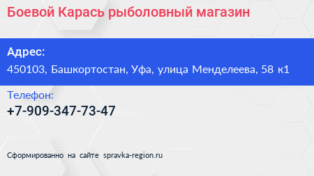 Боевой Карась, рыболовный магазин по адресу 450103, Башкортостан, Уфа, улица Менделеева, 58 к1 в дальнейшем Организация, размещена в следующих категориях:
