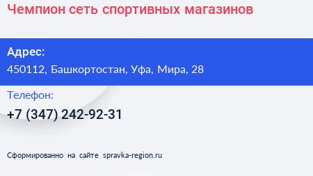 Чемпион, сеть спортивных магазинов по адресу 450112, Башкортостан, Уфа, Мира, 28 в дальнейшем Организация, размещена в следующих категориях: