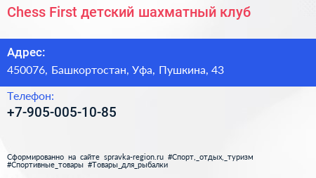 Chess First, детский шахматный клуб по адресу 450076, Башкортостан, Уфа, Пушкина, 43 в дальнейшем Организация, размещена в следующих категориях: