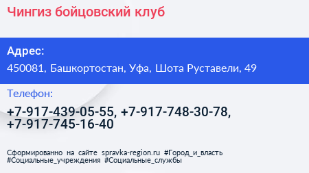 Чингиз, бойцовский клуб по адресу 450081, Башкортостан, Уфа, Шота Руставели, 49 в дальнейшем Организация, размещена в следующих категориях: