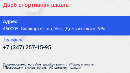 Дарб, спортивная школа по адресу 450005, Башкортостан, Уфа, Достоевского, 99а в дальнейшем Организация, размещена в следующих категориях: