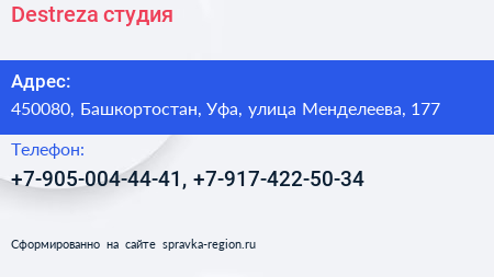 Destreza, студия по адресу 450080, Башкортостан, Уфа, улица Менделеева, 177 в дальнейшем Организация, размещена в следующих категориях: