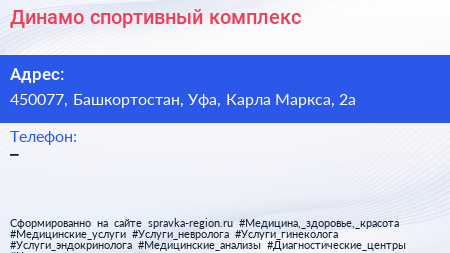 Динамо, спортивный комплекс по адресу 450077, Башкортостан, Уфа, Карла Маркса, 2а в дальнейшем Организация, размещена в следующих категориях: