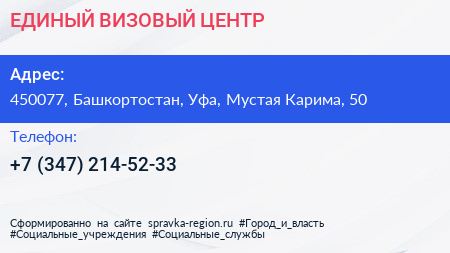 ЕДИНЫЙ ВИЗОВЫЙ ЦЕНТР по адресу 450077, Башкортостан, Уфа, Мустая Карима, 50 в дальнейшем Организация, размещена в следующих категориях: