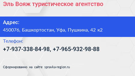 Эль-Вояж, туристическое агентство по адресу 450076, Башкортостан, Уфа, Пушкина, 42 к2 в дальнейшем Организация, размещена в следующих категориях: