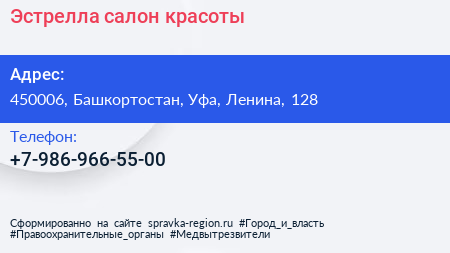 Эстрелла, салон красоты по адресу 450006, Башкортостан, Уфа, Ленина, 128 в дальнейшем Организация, размещена в следующих категориях: