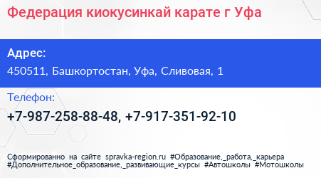 Федерация киокусинкай карате, г. Уфа по адресу 450511, Башкортостан, Уфа, Сливовая, 1 в дальнейшем Организация, размещена в следующих категориях: