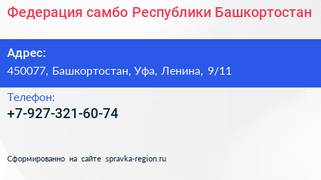 Федерация самбо Республики Башкортостан по адресу 450077, Башкортостан, Уфа, Ленина, 9/11 в дальнейшем Организация, размещена в следующих категориях: