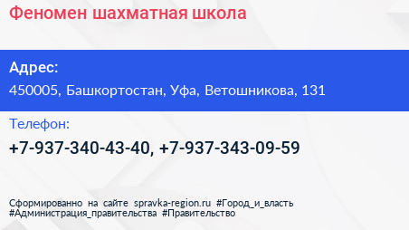 Феномен, шахматная школа по адресу 450005, Башкортостан, Уфа, Ветошникова, 131 в дальнейшем Организация, размещена в следующих категориях: