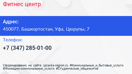 Фитнес-центр по адресу 450077, Башкортостан, Уфа, Цюрупы, 7 в дальнейшем Организация, размещена в следующих категориях: