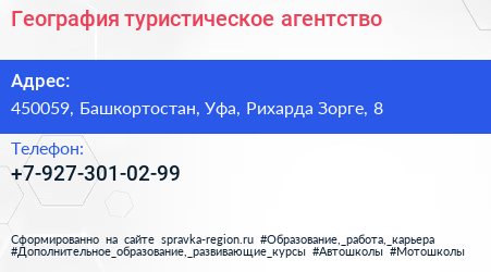 География, туристическое агентство по адресу 450059, Башкортостан, Уфа, Рихарда Зорге, 8 в дальнейшем Организация, размещена в следующих категориях: