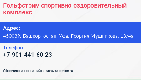 Гольфстрим, спортивно-оздоровительный комплекс по адресу 450039, Башкортостан, Уфа, Георгия Мушникова, 13/4а в дальнейшем Организация, размещена в следующих категориях: