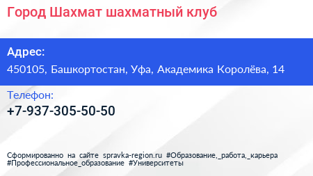 Город Шахмат, шахматный клуб по адресу 450105, Башкортостан, Уфа, Академика Королёва, 14 в дальнейшем Организация, размещена в следующих категориях: