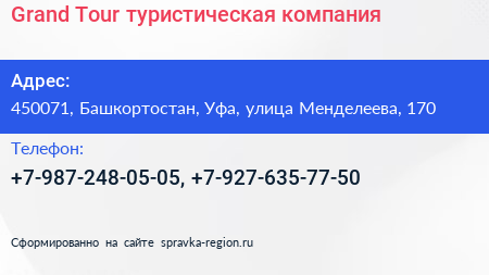 Grand Tour, туристическая компания по адресу 450071, Башкортостан, Уфа, улица Менделеева, 170 в дальнейшем Организация, размещена в следующих категориях: