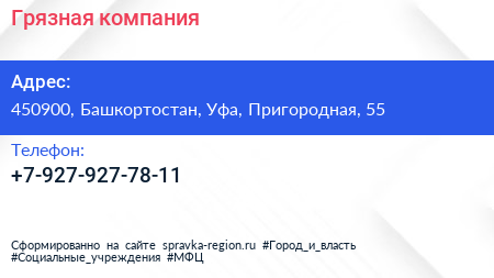 Грязная компания по адресу 450900, Башкортостан, Уфа, Пригородная, 55 в дальнейшем Организация, размещена в следующих категориях: