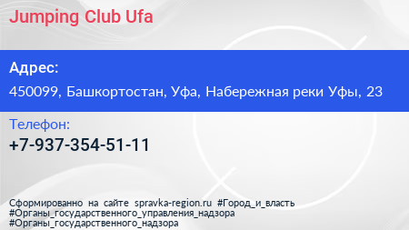 Jumping Club Ufa по адресу 450099, Башкортостан, Уфа, Набережная реки Уфы, 23 в дальнейшем Организация, размещена в следующих категориях: