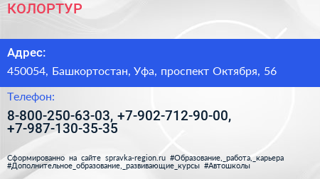 КОЛОРТУР по адресу 450054, Башкортостан, Уфа, проспект Октября, 56 в дальнейшем Организация, размещена в следующих категориях: