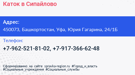 Каток в Сипайлово по адресу 450073, Башкортостан, Уфа, Юрия Гагарина, 24/1Б в дальнейшем Организация, размещена в следующих категориях: