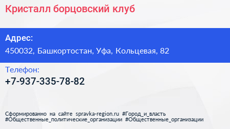 Кристалл, борцовский клуб по адресу 450032, Башкортостан, Уфа, Кольцевая, 82 в дальнейшем Организация, размещена в следующих категориях: