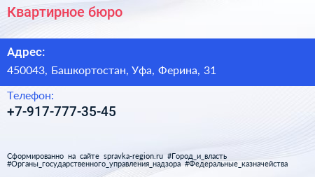 Квартирное бюро по адресу 450043, Башкортостан, Уфа, Ферина, 31 в дальнейшем Организация, размещена в следующих категориях: