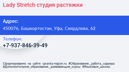 Lady Stretch, студия растяжки по адресу 450076, Башкортостан, Уфа, Свердлова, 62 в дальнейшем Организация, размещена в следующих категориях: