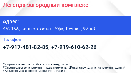 Легенда, загородный комплекс по адресу 452156, Башкортостан, Уфа, Речная, 97 к3 в дальнейшем Организация, размещена в следующих категориях: