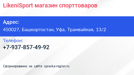 LikeniSport, магазин спорттоваров по адресу 450027, Башкортостан, Уфа, Трамвайная, 13/2 в дальнейшем Организация, размещена в следующих категориях:
