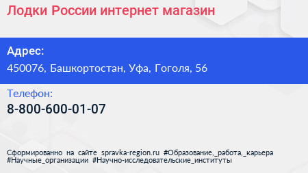 Лодки России, интернет-магазин по адресу 450076, Башкортостан, Уфа, Гоголя, 56 в дальнейшем Организация, размещена в следующих категориях: