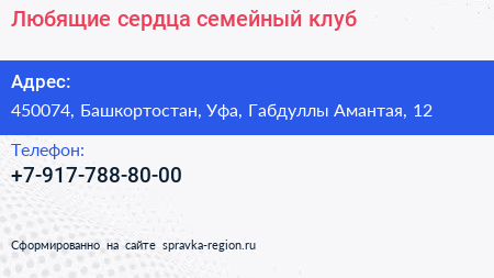 Любящие сердца, семейный клуб по адресу 450074, Башкортостан, Уфа, Габдуллы Амантая, 12 в дальнейшем Организация, размещена в следующих категориях: