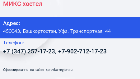 МИКС, хостел по адресу 450043, Башкортостан, Уфа, Транспортная, 44 в дальнейшем Организация, размещена в следующих категориях: