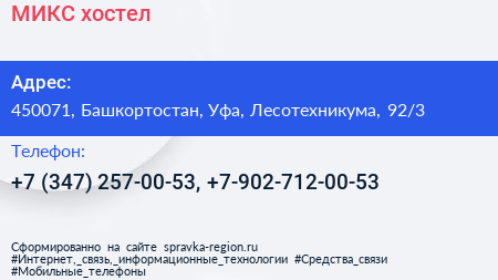 МИКС, хостел по адресу 450071, Башкортостан, Уфа, Лесотехникума, 92/3 в дальнейшем Организация, размещена в следующих категориях: