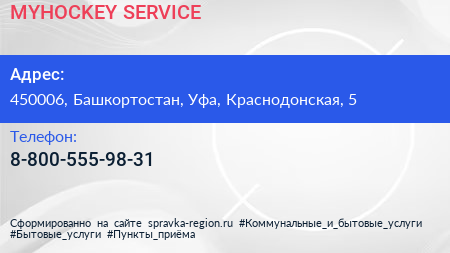 MYHOCKEY SERVICE по адресу 450006, Башкортостан, Уфа, Краснодонская, 5 в дальнейшем Организация, размещена в следующих категориях: