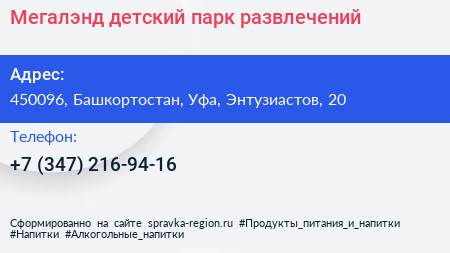Мегалэнд, детский парк развлечений по адресу 450096, Башкортостан, Уфа, Энтузиастов, 20 в дальнейшем Организация, размещена в следующих категориях: