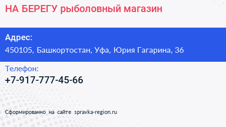 НА БЕРЕГУ, рыболовный магазин по адресу 450105, Башкортостан, Уфа, Юрия Гагарина, 36 в дальнейшем Организация, размещена в следующих категориях: