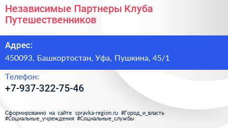Независимые Партнеры Клуба Путешественников по адресу 450093, Башкортостан, Уфа, Пушкина, 45/1 в дальнейшем Организация, размещена в следующих категориях: