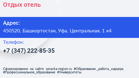 Отдых, отель по адресу 450520, Башкортостан, Уфа, Центральная, 1 к4 в дальнейшем Организация, размещена в следующих категориях: