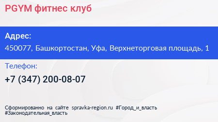 PGYM, фитнес-клуб по адресу 450077, Башкортостан, Уфа, Верхнеторговая площадь, 1 в дальнейшем Организация, размещена в следующих категориях: