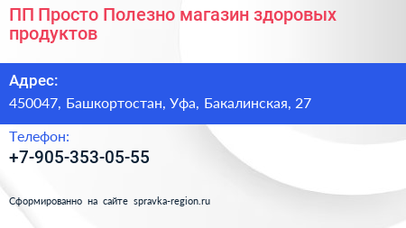 ПП-Просто Полезно, магазин здоровых продуктов по адресу 450047, Башкортостан, Уфа, Бакалинская, 27 в дальнейшем Организация, размещена в следующих категориях: