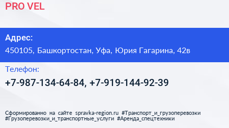 PRO-VEL по адресу 450105, Башкортостан, Уфа, Юрия Гагарина, 42в в дальнейшем Организация, размещена в следующих категориях: