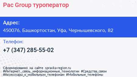 Pac Group, туроператор по адресу 450076, Башкортостан, Уфа, Чернышевского, 82 в дальнейшем Организация, размещена в следующих категориях: