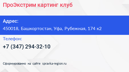 ПроЭкстрим, картинг-клуб по адресу 450018, Башкортостан, Уфа, Рубежная, 174 к2 в дальнейшем Организация, размещена в следующих категориях: