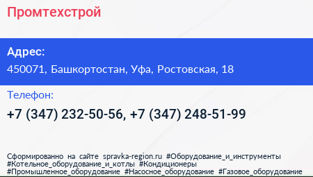 Промтехстрой по адресу 450071, Башкортостан, Уфа, Ростовская, 18 в дальнейшем Организация, размещена в следующих категориях: