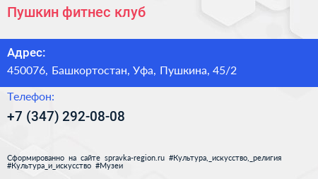 Пушкин, фитнес-клуб по адресу 450076, Башкортостан, Уфа, Пушкина, 45/2 в дальнейшем Организация, размещена в следующих категориях: