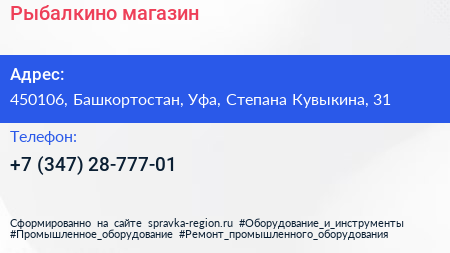 Рыбалкино, магазин по адресу 450106, Башкортостан, Уфа, Степана Кувыкина, 31 в дальнейшем Организация, размещена в следующих категориях: