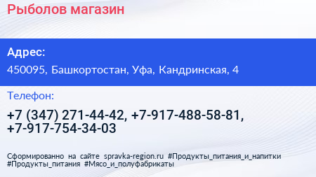 Рыболов, магазин по адресу 450095, Башкортостан, Уфа, Кандринская, 4 в дальнейшем Организация, размещена в следующих категориях: