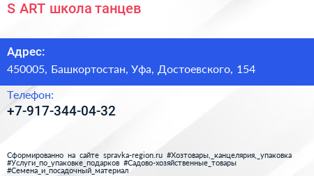 S-АRT, школа танцев по адресу 450005, Башкортостан, Уфа, Достоевского, 154 в дальнейшем Организация, размещена в следующих категориях: